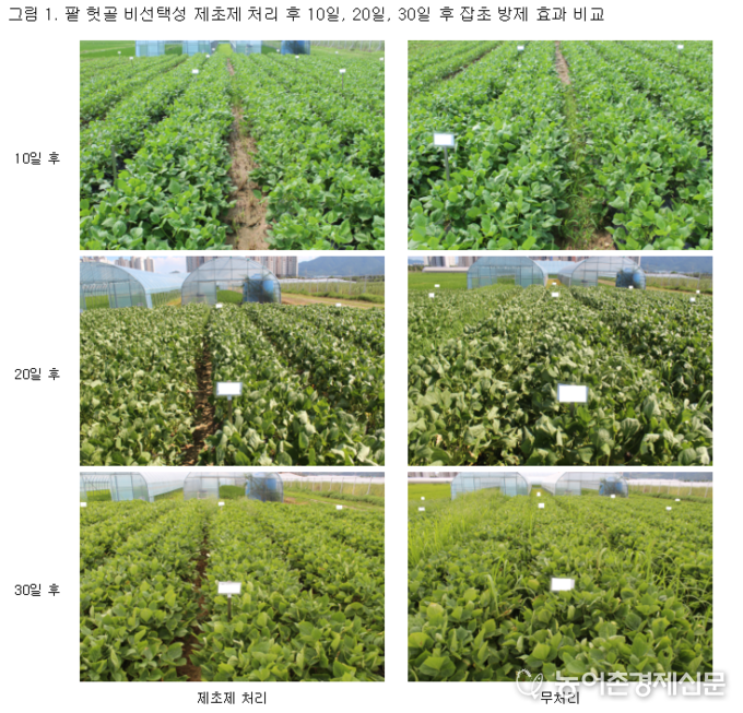 작물과 작물 사이의 헛골에는 작물과 잡초를 구별하지 않고 모두 죽이는 비선택성 제초제를 사용하고, 토양 처리제를 뿌린 뒤에는 경엽처리1) 제초제를 이어 뿌려 효과를 높이도록 한다.