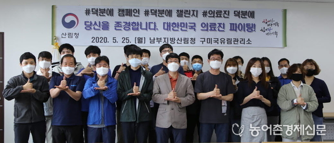 산림청 구미국유림관리소(소장 박승규)는 25일 신종 코로나바이러스 감염증(코로나-19) 극복을 위해 헌신하고 있는 수많은 의료진에게 감사와 응원을 전하는 “덕분에 챌린지”에 동참하였다.