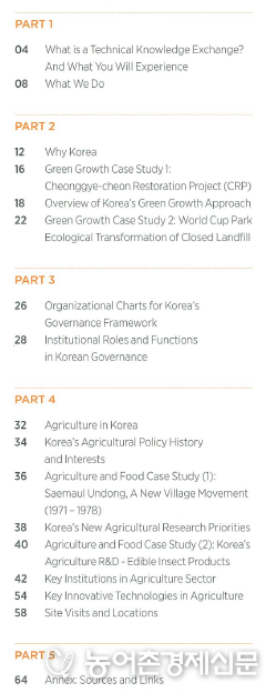 - 최근 한국농업 발전에 대한 높은 관심을 반영해 지식교류 가이드북으로는 처음으로 한국농업을 소개하는 ‘한국농업 가이드북’ 발간을 추진하게 됐다.