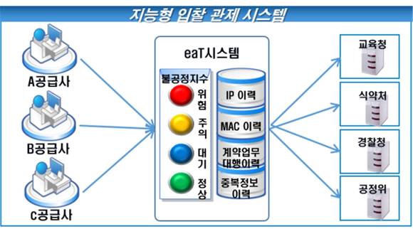 또한 eaT시스템의 「지능형 입찰비리 관제시스템」은 입찰담합 등 비리가 의심되는 정보를 모니터링 해 불공정지수를 4단계로 자동 산정하며, aT는 불공정지수 위험 단계에 이른 130여개 업체 정보를 교육부·식약처·경찰청 등과 공유하여, 순차적으로 업체 전수조사를 실시할 예정이다.