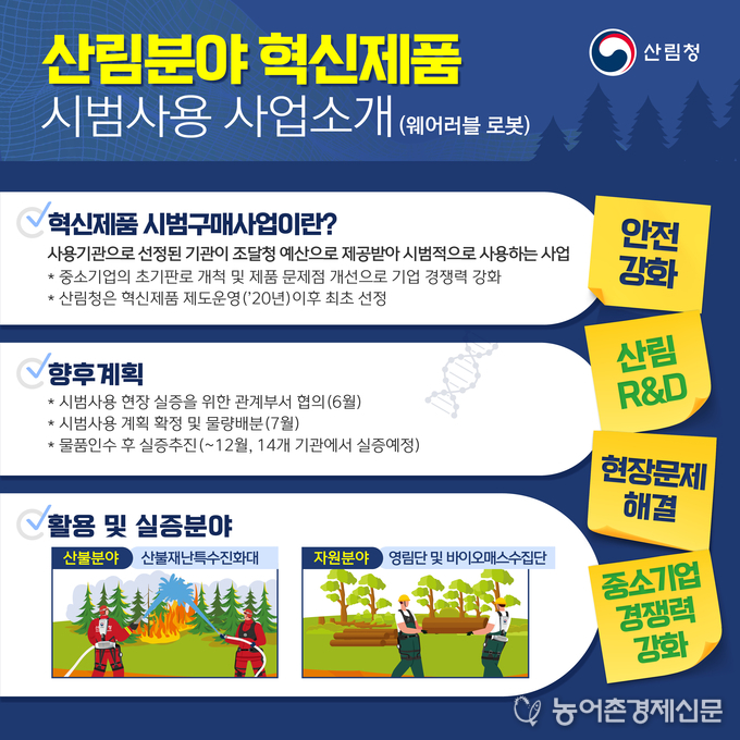 산림청(청장 남성현)은 조달청에서 실시한 ’24년 혁신제품 시범사용 제품으로 ‘산불진화 웨어러블 로봇’이 최종 선정됐다고 10일 밝혔다.