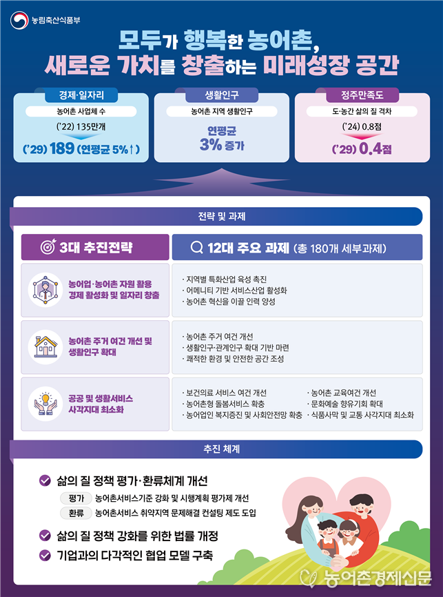 이러한 점을 감안하여 이번 기본계획은 그간의 기본계획과 달리 농어촌 경제 활성화 및 일자리 창출에 중점을 두었고, 21개 부처·청이 합동으로 ① 경제 활성화 및 일자리 창출, ② 농어촌 주거여건 개선 및 생활인구 확대, ③ 공공․생활서비스 사각지대 최소화 등 3대 전략에 따라 12대 주요 과제 및 180개 세부 과제를 추진한다.