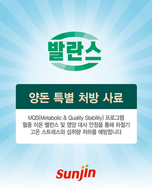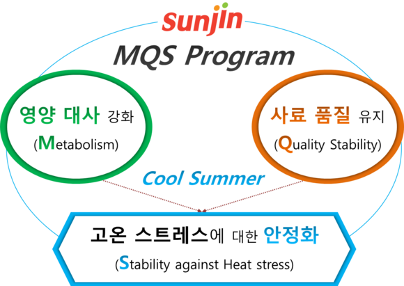 선진은 그러한 큰 2가지 문제를 동시에 해결하기 위하여 돼지의 영양 대사를 강화하고 사료의 품질을 유지할 수 있는 복합 솔루션인 MQS(Metabolic & Quality Stability) Program을 통하여 여름철 더위로 발생하는 문제를 해결하고자 한다. 돼지의 영양 대사 안정을 위한 종합비타민 강화 및 혈중 pH를 조절할 수 있는 특별 처방 사료를 공급하고 사료 제품의 안정성 강화를 위한 독소 예방을 집중적으로 관리할 계획이다. 또한, 농장에 실질적인 도움을 주기 위하여 여름철 사양관리 관련 인포그래픽 제작 및 배포 등의 스킨십 활동을 전개하고 있다.