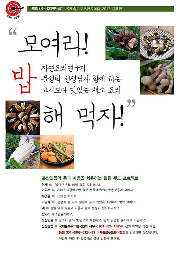 이런 상화에서 국제슬로푸드한국협회가 주관하는 “모여라! 밥 해 먹자!”는 혼밥족들을 대상으로 몸과 마음을 치유할 수 있는 힐링 푸드 프로젝트로 기획되었다.