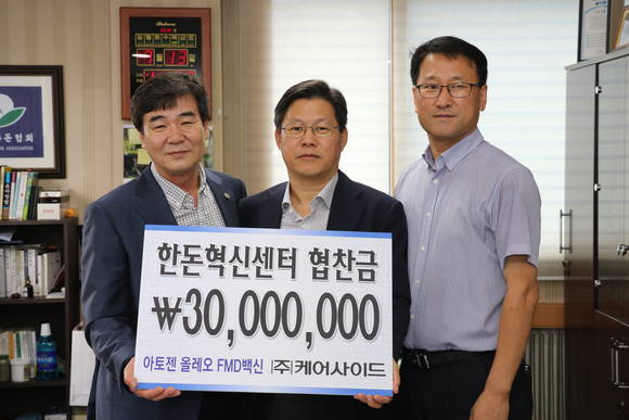 ㈜케어사이드(대표이사 유영국)에서 지난 07월 13일 대한한돈협회를 방문하고 이병규 한돈협회 회장에게 한돈혁신센터 건립기금 3천만원을 기탁했다. ㈜케어사이드의 기금 기탁은 지난해 12월 한돈산업발전기금 3천만원 전달에 이어 두 번째이다.