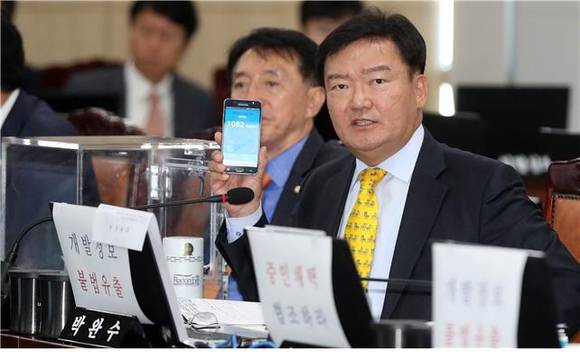 <2018년도 국회 국토교통위원회의 국토교통부에 대한 국정감사가 실시된 10일 오전 정부세종청사 국토교통부 대회의실에 마련된 국정감사장에서 자유한국당 민경욱 의원이 건축 자재 라돈에서 검출된 방사선 수치를 보여주고 있다.>