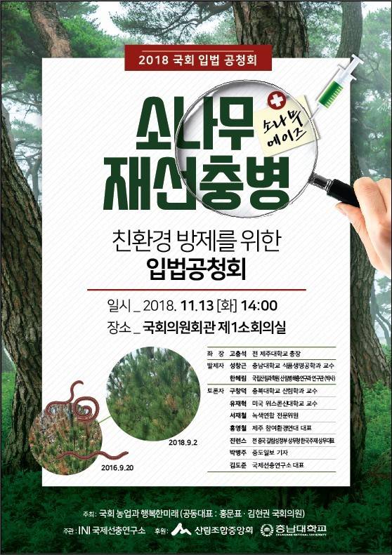 자유한국당 홍문표 국회의원(자유한국당, 충남 예산․홍성)국회의원이 공대표로 있는 ‘국회 농업과 행복한 미래’가 주최하고 국제선충연구소가 주관하며, 산림조합중앙회, 충남대학교가 후원하는 ‘소나무 재선충병 친환경 방제’를 위한 입법 공청회가 11월 13일 화요일 오후 2시, 국회 의원회관 제1소회의실에서 개최될 예정이다.