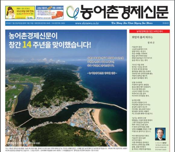 사이트의 콘텐츠는 저작권의 보호를 받는바 무단전제, 복사, 배포 등을 금합니다. 서울특별시 영등포구 여의도동 44-35 제일빌딩 705호 농어촌경제신문 Tel (02)785-9449 Fax : (02)785-9459 대표자(발행인) : 함석구 |편집인 : 구자숙 copyright 2016 EKRNEWS. All rights reserved