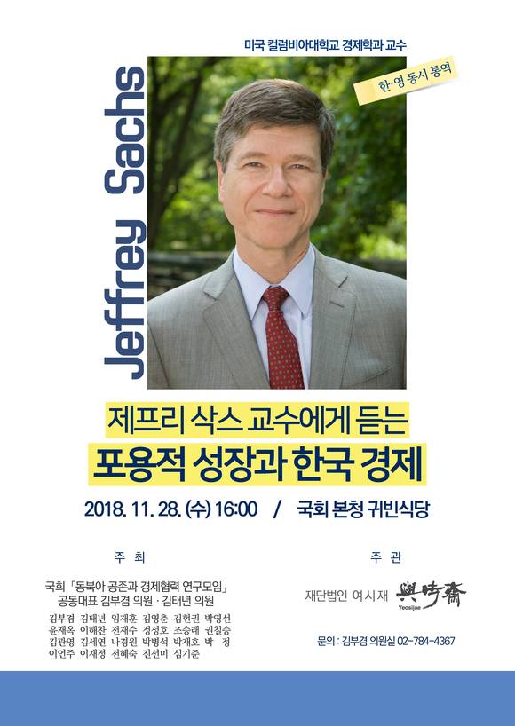 국회의원 연구단체 「동북아 공존과 경제협력 연구모임(공동대표: 김부겸, 김태년」의 주최, 「재단법인 여시재(이사장: 이헌재, 원장: 이광재)」의 주관으로 11월 28일 수요일 오후 4시 국회 본청 귀빈식당에서 <‘제프리 삭스’ 교수 초청강연 “제프리 삭스 교수에게 듣는 포용적 성장과 한국경제”>가 진행된다.