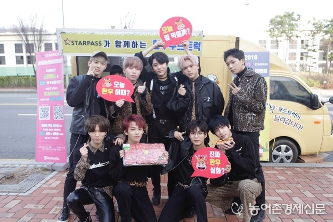 지난 4일(화), 서울 마포구 SBS프리즘타워 앞에서 아이돌 그룹 ‘드림노트’가 한우선물세트를 받고 기념촬영을 하고 있다. 이날 한우자조금은 아이돌 팬덤 플랫폼 ‘스타패스’와 함께 SBS MTV <더쇼> 방송 녹화를 마친 아이돌 그룹 ‘네이처’, ‘디크런치’, ‘드림노트’에게 한우 푸드트럭을 활용한 즉석 한우 불고기와 채끝 시식을 비롯해 한우선물세트를 증정하고, 현장을 찾은 팬을 대상으로 무료 시식회를 진행해 큰 호응을 얻었다.