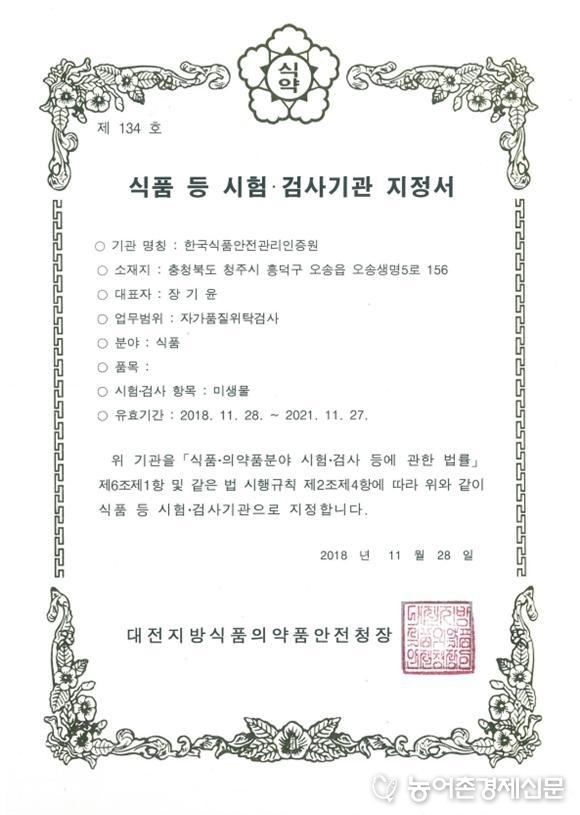 한국식품안전관리인증원(원장 장기윤, 이하 HACCP인증원)은 최근 대전지방식약청으로부터 식품 등 미생물분야 시험·검사기관으로 신규 지정받아 2019년 1월 2일부터 업무를 시작한다.