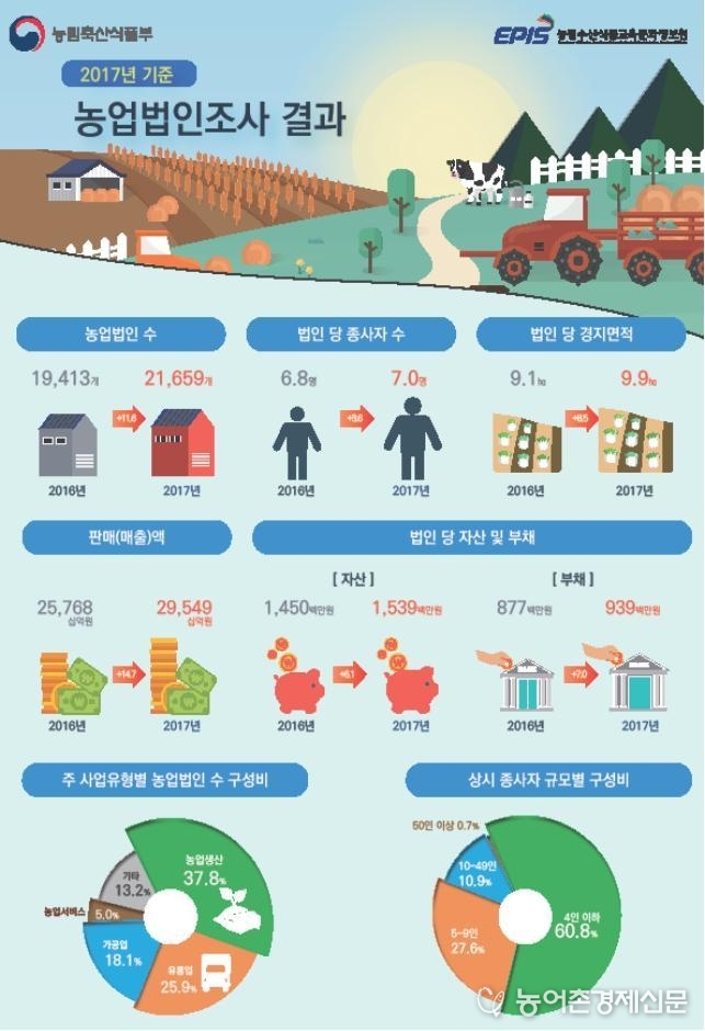농림축산식품부(장관 이개호, 이하 농식품부)와 농림수산식품교육문화정보원은 ‘17년말 기준 농업법인의 생산구조, 경영실적 등 ‘농업법인조사 결과’를 발표하였다.