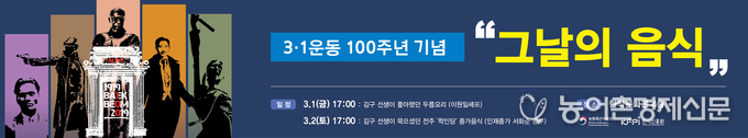 한식진흥원(이사장 선재)은 한국콘텐츠진흥원(원장 김영준)과 함께 한식문화관에서 3.1운동 100돌을 맞이하여 백범 김구 선생이 즐겨 먹던 ‘그날의 음식’ 만들기 체험 프로그램을 진행할 예정이다.