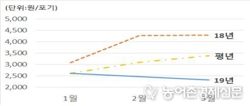 평년·전년의 3월에는 월동배추 가격이 상승세를 보였으나, 올해 3월 가격은 하락세가 이어지고 있는 상황이다. 다만, 정부의 시장격리 등 가격안정대책 시행으로 향후 보합세를 보일 것으로 전망된다.
