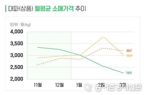 최근 가격 하락세의 원인은 KREI 농업관측월보에 따르면 11월부터 출하되는 전남지역의 ’18년산 대파 재배면적이 평년대비 14% 증가한 것과 9월 이후 기상호조로 인한 생육 호전으로 생산량이 크게 늘어난 것으로 분석된다.