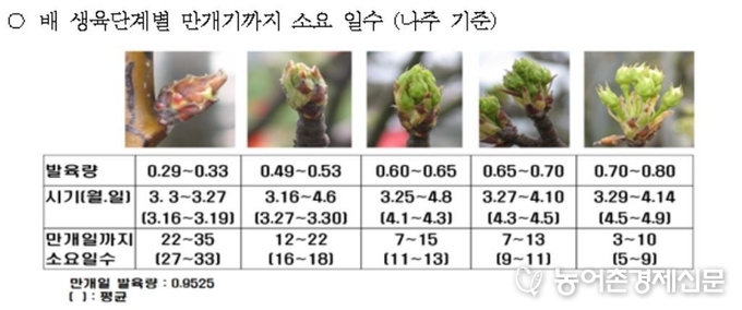 다만, 개화 시기는 3월 이후의 기온이 가장 큰 영향을 끼치므로 앞으로 이상 고온이나 이상 저온이 발생할 경우 실제 꽃 피는 시기는 다를 수 있다. 이에 과수원의 눈 발육 상태를 자주 확인해 인공수분 등 농작업에 차질이 발생하지 않도록 준비해 둔다.