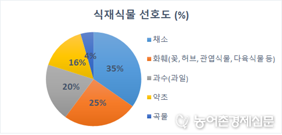 심고 싶은 식물로는 채소, 화훼(꽃, 허브 등), 과수, 약용작물, 곡류를 꼽았다.