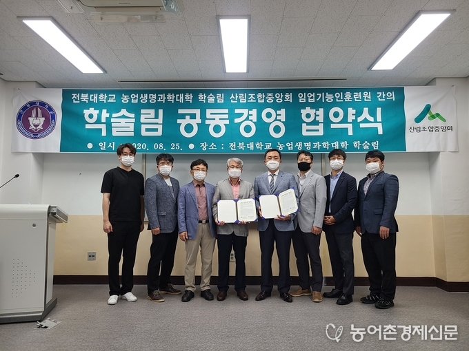 산림조합중앙회 임업기능인훈련원(원장 강석주)은 8월 25일, 전북대학교 학술림사무소에서 전북대학교 농업생명과학대학 학술림(학술림장 박종민)과 학술림 공동경영을 위한 업무협약을 체결했다.