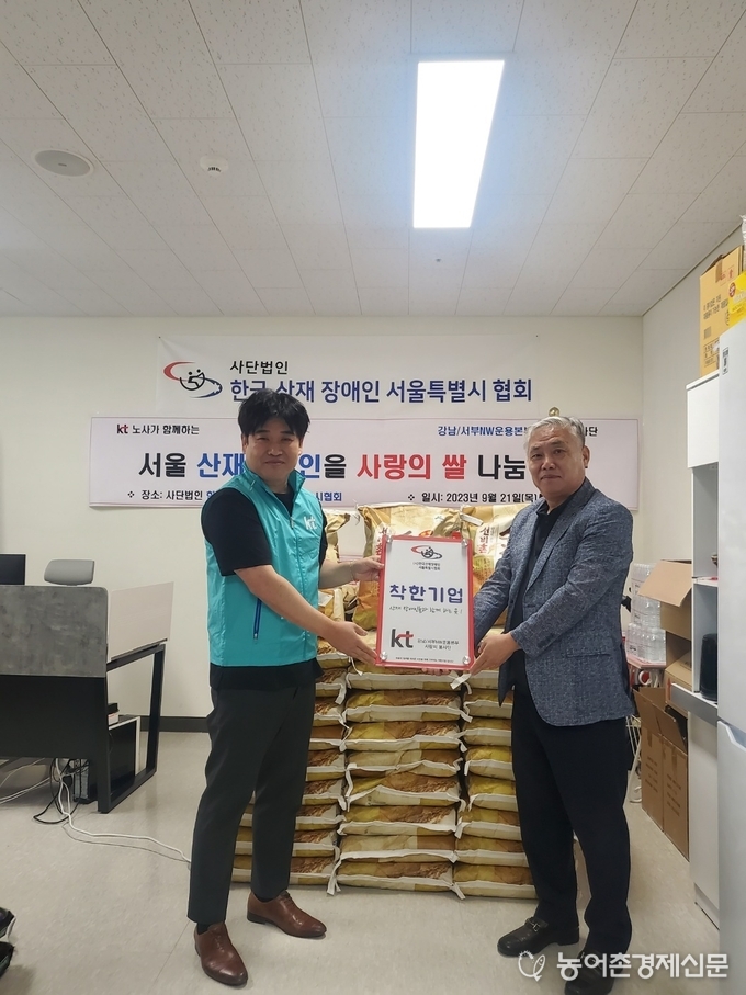 강남/서부NW운용본부, 방대혁상무와 서정호지부장 등 사랑의 봉사단은 2023년 9월26일 서울특별시 산재장애인협회를 방문하여 홍은기회장과 면담하고 어려운 장애인들에게 작은 보탬이 될 수 있기를 희망한다며 쌀20kg 50포대를 기증하였다.