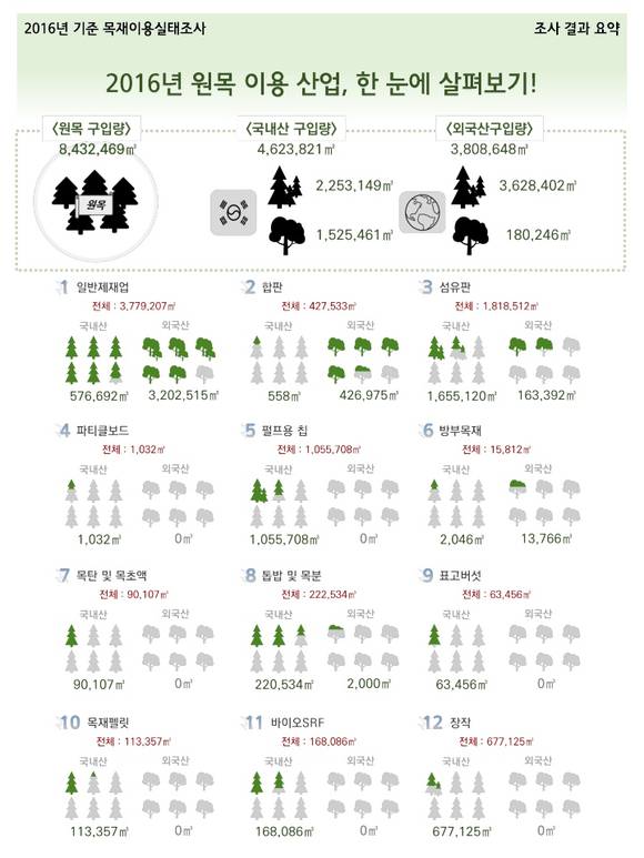 산림청은 목재산업의 현황을 파악하기 위해 2007년부터 한국임업진흥원에 위탁해 매년 목재이용실태를 조사하고 있다.