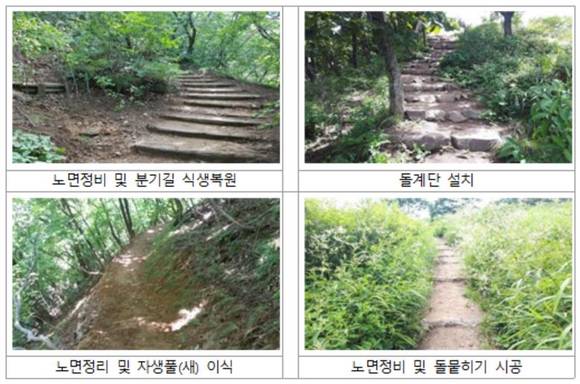 한편, 산림청은 백두대간 마루금 훼손등산로의 생태적 정비·복원을 위해 지난해 등산로 정비 법적 근거를 마련했으며, 올해는 신규예산 8억원(10km)을 확보해 마루금 주변 훼손지 정비와 외래식물 제거 등을 진행 중이다.