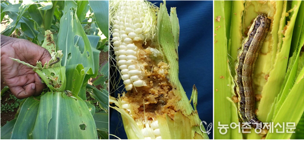 <열대거세미나방 옥수수 피해 증상 및 노숙 유충