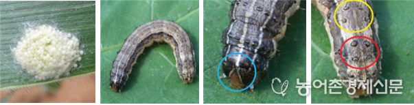<열대거세미나방 알덩어리(좌) 및 애벌레(출처: FAO, 2017)>