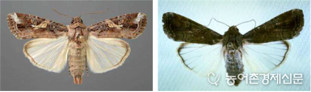 <열대거세미나방 성충: 수컷(좌; 출처: Goergen 등, 2017)), 암컷(우; 출처: EPPO, 2018)>