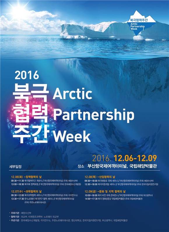 해양수산부(장관 김영석)는 12월 6일(화)부터 9일(금)까지 4일간 부산항 국제여객터미널, 국립해양박물관 등지에서 ‘지속가능한 북극개발을 위한 파트너십 구축(Partnership for a Sustainable Arctic)’을 주제로 ‘2016 북극협력주간(Arctic Partnership Week 2016)’을 개최한다. 행사에는 김영석 해양수산부 장관, 테로 바우라스테(Tero Vauraste) 북극경제이사회 부의장 등 국내외 산학연 관계자 600여명이 참석할 예정이다.