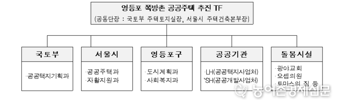 원활한 사업추진을 위해 국토부, 서울시, 영등포구, LHㆍSH, 민간돌봄시설이 참여하는 ‘영등포 쪽방촌 공공주택 추진 민관공 TF’를 구성·운영한다.