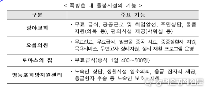 - 돌봄시설에서는 쪽방 주민 뿐 아니라 인근 거리 노숙인을 위한 자활·상담, 무료급식·진료 등의 기능도 겸하고 있어, 이번 사업으로 인하여 노숙인 보호·지원(상담, 일자리지원, 위생서비스 등)등에 공백이 발생하지 않도록 종합적인 복지서비스를 제공할 계획이다.