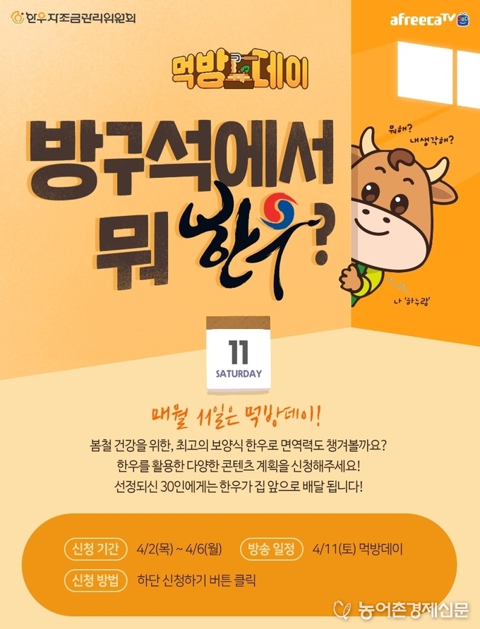 한우산업의 안정적 발전을 위해 설립된 한우자조금관리위원회(위원장 민경천, 이하 한우자조금)가 오는 4월 11일 아프리카TV에서 한우를 소재로 한 먹방 콘텐츠 참여자를 2일부터 6일까지 5일간 모집한다.