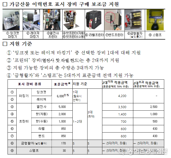 보조금은 최대 3대까지 지원하며, 금형활자와 스탬프는 5대까지 전액 지원한다.