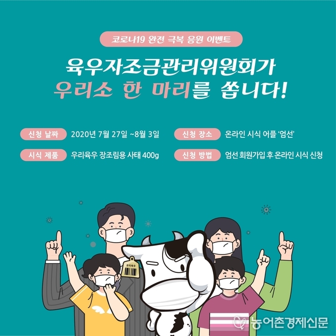 육우자조금은 코로나19(신종 코로나바이러스 감염증)로 인한 육우 소비 침체를 해소하는 유통활성화 일환으로 소비자 온라인 마케팅을 지속∙강화하는 한편 코로나19로 지친 소비자들에게 심심한 위로와 용기를 전달하고자 이번 온라인 이벤트를 확대해 마련했다.