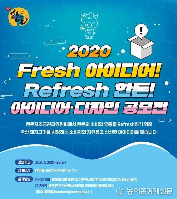 한돈자조금관리위원회(이하 한돈자조금)가 신선한 한돈 유통을 위한 아이디어 및 패키지 개발을 위해 8월 3일부터 28일까지 4주간 ‘2020 한돈팩 아이디어·패키지 공모전’을 운영한다.