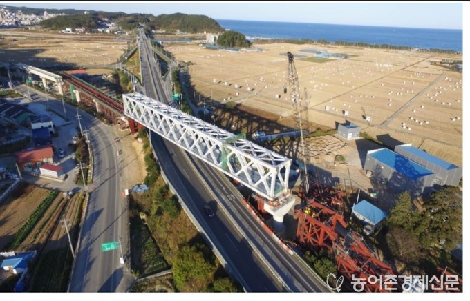 국가철도공단 영남본부(본부장 이계승)는 동해선 포항∼삼척 철도사업 중 국토 7호선을 횡단하는 트러스교*(왕피천교) 설치공사를 성공적으로 마무리했다고 24일(화) 밝혔다.