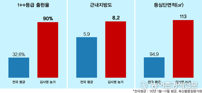 올해 대통령상의 영예를 얻은 김사영 대표는 아들 김두련씨와 함께 한우 275 두를 사육하고 있으며, 평가기간 동안 한우 31두를 출하하여 전 두수 1+등급 이상 획득, 1++등급 출현율 90%이상 등의 우수한 성과를 이루어냈다. 김사영 대표의 경우 외부에서 송아지를 구입 하지 않고 100% 자가생산하며, 평균 근내지방도가 8.2로 전국 평균보다 2.3 높았으며, 평균 사육개월령은 29.3개월로 전국 평균 30.4개월에 비해 1.1개월 적었다. 또한 도체중과 등심단면적이 전국 평균보다 각각 27kg, 18.1㎠ 높아 육질뿐만 아니라 육량에도 탁월한 성적을 보였다. 김사영 대표의 수상비결은 철저히 기본기를 지키는 것에 있었다. 김사영 대표는 모든 축사를 청결하게 유지하기 위해 노력하였고, 이 노력은 친환경농장인증 획득으로 이어졌다. 김사영 대표는 “한우 개량은 단시간에 노력한다고 이뤄지는 것은 아니다. 철저한 기록관리를 통한 데이터 분석과 확고한 신념을 가지고 기본을 지켜나간다면 반드시 언젠간 성공할 수 있다.”라고 전했다.