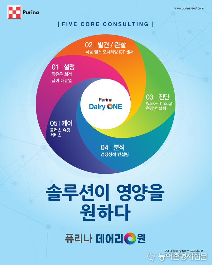 결국 반추동물인 젖소의 분리급여는 최적화된 영양과 탁월한 솔루션이 더해진 컨설팅이 접목되어 진행되어야 한다. 최근 편한 축산을 잘못 인식하고 손쉽게 도입하여 어려움을 겪고 있는 목장과 잘못된 시장의 흐름을 바로 잡고자 퓨리나사료(대표이사: 박용순 / www.purinafeed.co.kr) 에서 분리급여에 최적화된 ‘데어리원’ 낙농 프로그램과 파이브코어 컨설팅(Five Core Consulting) 서비스를 선보였다. 퓨리나 데어리원 신제품은 좋은 섬유소원인 호주직수입 연맥과 국내 독점 계약된 이스트 컬쳐, 그리고 고가의 열처리된 대두박을 첨가하여 보다 반추위의 발효 안정성과 조사료 분해율 증가, 기호성 증대를 극대화 시켰다.