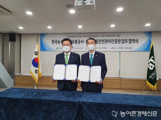 한국식품안전관리인증원(원장 조기원, 이하 HACCP인증원)과 한국농수산식품유통공사(사장 김춘진, 이하 aT)은 27일 서울 aT센터에서 업무협약(MOU)을 통해 국민에게 안전한 먹거리 제공을 위한 협력을 강화하기로 하였습니다.