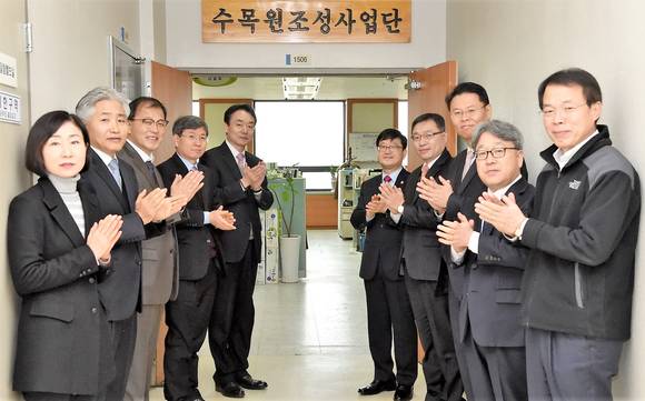 산림청이 7일 정부대전청사 산림청에서 신원섭 산림청장(오른쪽에서 다섯번째) 등이 참석한 가운데 '수목원조성사업단 현판식'을 가졌다.
