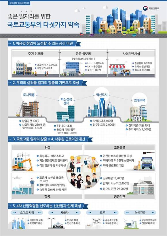 국토교통부 또한 일자리의 기반이 되는 도시·산단·교통 등의 인프라를 조성하고 관련 산업 종사자가 전체 근로자의 15%에 이르는 일자리 관련 주요 부처로서, 올해 업무계획의 최우선 목표로 ‘양질의 일자리 창출’을 선정하고 이를 적극 추진해왔다.
