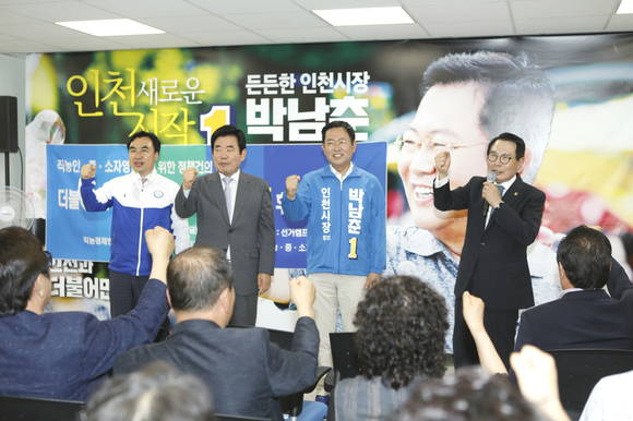 1일 낮 남구 주안동 박남춘 후보 선거사무실에서는 ‘직능경제인단체 총연합회’ 오호석 총회장과 인천지역 중·소자영업자, 김진표 민주당 전 원내대표, 윤관석 인천시당위원장 등 200여 명이 참석한 가운데 인천지역 120여개 직능인 중·소 자영업자들이 박남춘 후보 지지를 선언하고 정책 건의서를 전달하는 행사가 열렸다.