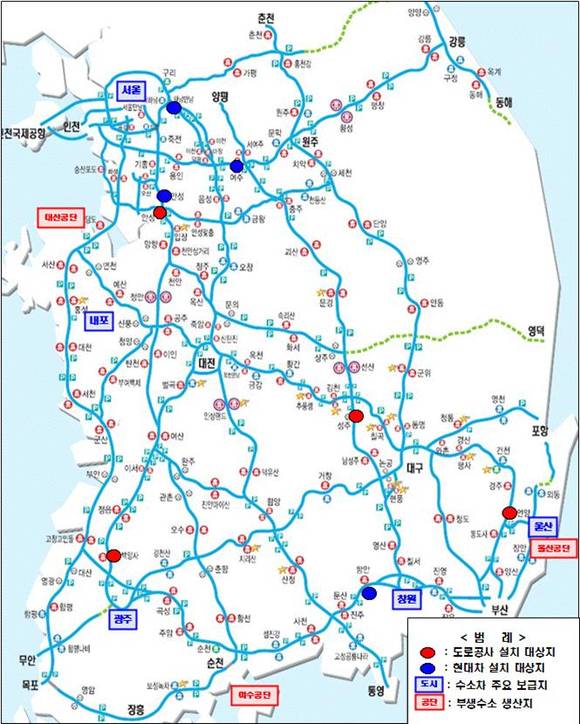 이에 국토교통부와 한국도로공사는 전국 고속도로 네트워크 망을 이용한 충전소 구축으로 수소차 보급을 지원하기 위하여 차량제조사 및 수소업계 등과 힘을 모아 금년 중 고속도로 휴게소 8곳에 수소차 충전소를 구축하기로 했으며, (2월에 구축된 영동고속도로 여주휴게소(강릉방향) 포함)