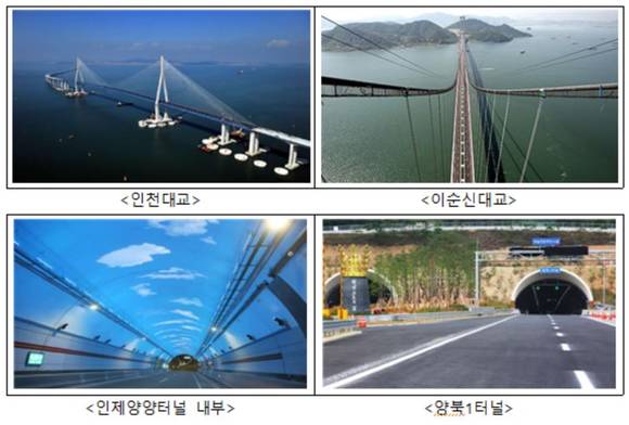 한편, 도로시설물 중 터널은 인제양양터널이 약 11km(10,962m)로 가장 길고, 교량은 인천대교가 약 12km(11,856m)로 가장 긴 것으로 조사되었다.