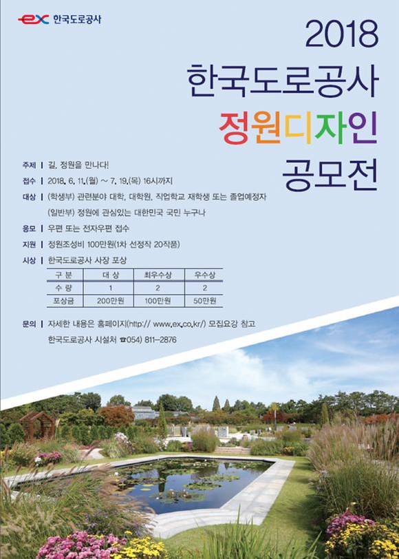 한국도로공사(사장 이강래)는 ‘2018 한국도로공사 정원디자인’을 11일부터 다음 달 19일까지 공개 모집한다고 밝혔다.