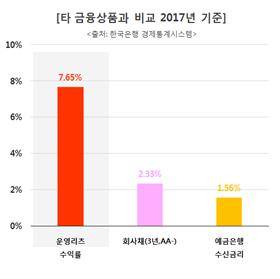 리츠 수익률은 `17년말 기준 예금은행 수신금리 1.56% 대비4배 이상의 높은 수익률이며 최근 3년평균 수익률은 8.57%로 지속적으로 안정적인 배당을 하고 있다.