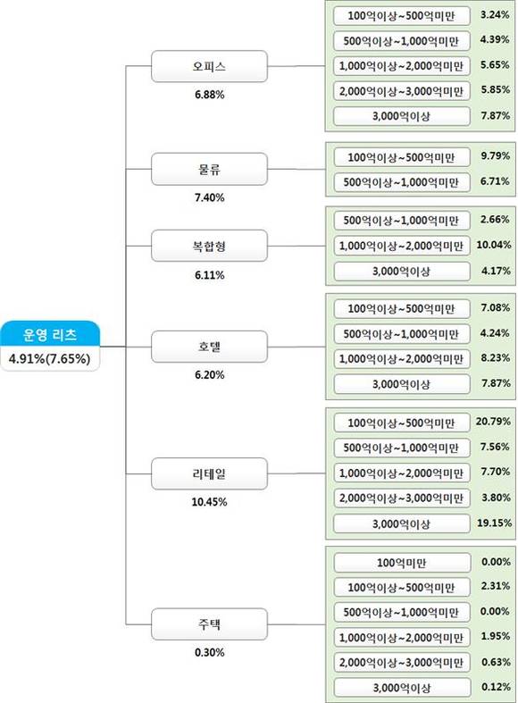 오피스에 투자하는 운영중인 리츠는 6.88%이며 리테일 리츠는 10.27%, 물류 리츠는 7.4%로 조사되었다. 특히 물류리츠는 전년(5.5%)대비 1.9%p 증가하였다.