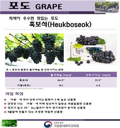 농촌진흥청(청장 라승용)은 높은 기온에서도 흑색으로 색이 잘 드는 알 굵은 국산 포도 품종 ‘흑보석’이 출하를 앞두고 있다고 밝혔다.‘흑보석’은 가온하우스에서 7월 초순부터 비가림 재배 시엔 8월 하순, 노지에서는 9월 상순부터 출하되는 품종이다.
