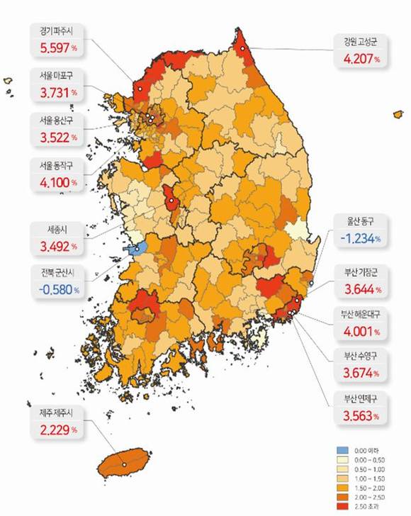 (시군구별, %) 경기 파주시(5.60)를 비롯해 강원 고성군(4.21), 서울 동작구(4.10), 부산 해운대구(4.00), 서울 마포구(3.73)가 높은 상승률을 보였으며, 울산 동구(-1.23), 전북 군산시(-0.58)는 하락하였고, 경북 포항북구(0.35), 충남 서천군(0.42), 경남 거제시(0.47)는 상대적으로 낮게 상승하였다.