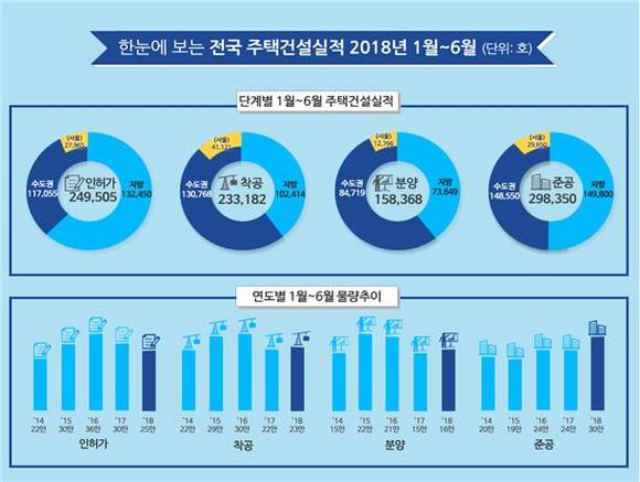 - (인허가) 상반기 25.0만호, 5년평균比 7.8% 감소, 전년比 16.2% 감소 - (착 공) 상반기 23.3만호, 5년평균比 3.4% 감소, 전년比 6.2% 증가 - (분 양) 상반기 15.8만호, 5년평균比 6.0% 감소, 전년比 9.1% 증가 - (준 공) 상반기 29.8만호, 5년평균比 42.1% 증가, 전년比 22.3% 증가 |